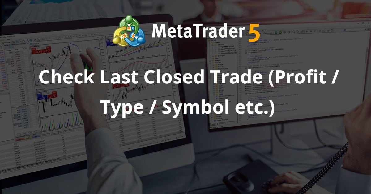 // variables string DayStart = "00:00"; // Day Start Time double LastClosed_Profit; // Last Closed trade profit string TradeSymbol, TradeType; // Expert Initializing -------------------- int OnInit() { return(INIT_SUCCEEDED); } // Expert DeInitializing ------------------- void OnDeinit(const int reason) { } // Expert OnTick -------------------------- void OnTick() { // check for last closed trade. CheckLastClosed(); } //+------------------------------------------------------------------+ //+------------------------------------------------------------------+ //| | //+------------------------------------------------------------------+ void CheckLastClosed() { datetime HistoryTime = StringToTime(DayStart); // history from "Day begining to current time if(HistorySelect(HistoryTime,TimeCurrent())) { int Total = HistoryDealsTotal(); // Get the last deal ticket number and select it to furthur work. ulong Ticket = HistoryDealGetTicket(Total -1); // Get what you need to get. LastClosed_Profit = NormalizeDouble(HistoryDealGetDouble(Ticket,DEAL_PROFIT),2); TradeSymbol = HistoryOrderGetString(Ticket,ORDER_SYMBOL); // Identify a sell trade. if(HistoryDealGetInteger(Ticket,DEAL_TYPE) == DEAL_TYPE_BUY) { TradeType = "Sell Trade"; } // Identify a buy trade if(HistoryDealGetInteger(Ticket,DEAL_TYPE) == DEAL_TYPE_SELL) { TradeType = "Buy Trade"; } // chart out put. Comment("\n","Deals Total - : ", Total, "\n","Last Deal Ticket - : ", Ticket, "\n", "Last Closed Profit -: ", LastClosed_Profit, "\n", "Last Trade was -: ", TradeType); } } //+------------------------------------------------------------------+ //+------------------------------------------------------------------+