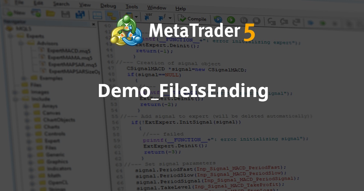 //--- show the window of input parameters when launching the script #property script_show_inputs //--- input parameters input string InpFileName="file.txt"; // file name input string InpDirectoryName="Data"; // directory name input int InpEncodingType=FILE_ANSI; // ANSI=32 or UNICODE=64 //+------------------------------------------------------------------+ //| Script program start function | //+------------------------------------------------------------------+ void OnStart() { //--- print the path to the file we are going to use PrintFormat("Working %s\\Files\\ folder",TerminalInfoString(TERMINAL_DATA_PATH)); //--- reset the error value ResetLastError(); //--- open the file for reading (if the file does not exist, the error will occur) int file_handle=FileOpen(InpDirectoryName+"//"+InpFileName,FILE_READ|FILE_TXT|InpEncodingType); if(file_handle!=INVALID_HANDLE) { //--- print the file contents while(!FileIsEnding(file_handle)) Print(FileReadString(file_handle)); //--- close the file FileClose(file_handle); } else PrintFormat("Error, code = %d",GetLastError()); }