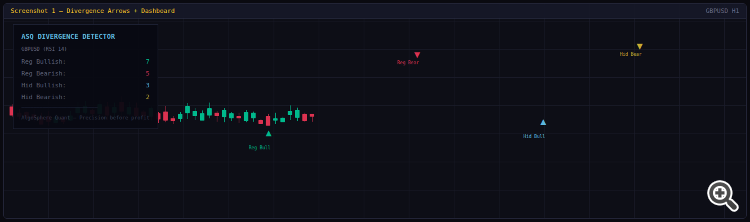 ASQ Divergence Detector scans your chart for regular and hidden RSI divergences and marks them with color-coded, non-repaint arrows. Each arrow is labeled with its type — Regular Bullish, Regular Bearish, Hidden Bullish, or Hidden Bearish — so you never have to guess what the signal means.