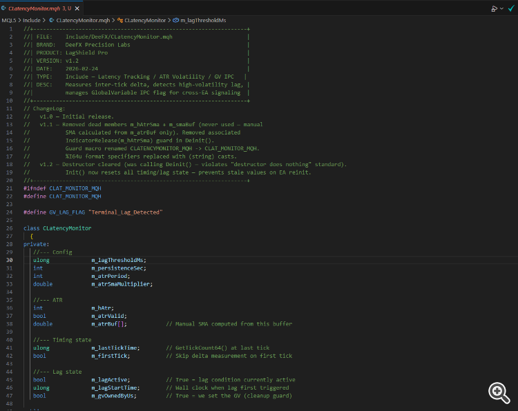 - v1.2 — Destructor cleared (previously called Deinit() , violating the "destructor does nothing" standard). Init() now explicitly resets all timing and lag state to prevent stale values when an EA reinitialises without a full terminal restart.