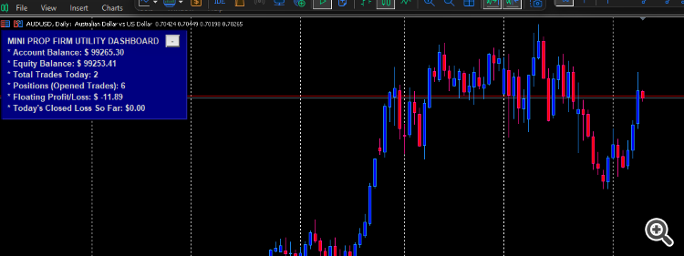 Te Mini Prop-Firm Traders Utility Dashboard dynamically analyzes all open and closed trades on the account and presents key metrics in a clean, easy-to-read interface directly on the chart. You don't need to open your MetaTrader's ToolBox before you know what is happening right from your chart! Every information you need to know to help you avoid trading errors and spontaneous trading.